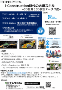i-Construction時代の必須スキル ~3D計測と3D設計データ作成 実践セミナー~ 開催日時:2025年11月18日(火) 13:00~16:30(受付開始 12:30)会場:i-Station(東日本ICT推 […]