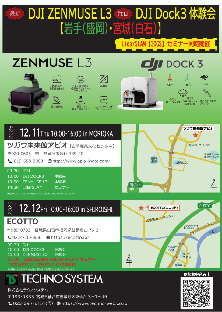 DJI 新製品(航空LiDARソリューション【ZENMUSE L3】・移動ドック【Dock3】)の体験会を、12月11日・12日に開催致しました。