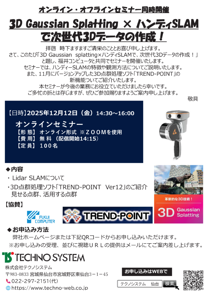 ※本セミナーは「宮城(白石)会場」のうち、「LidarSLAM+TREND-POINTセミナー」のみ、